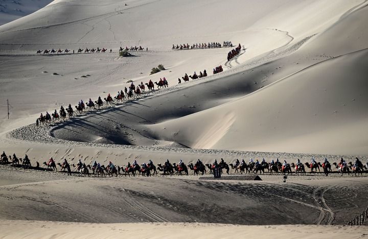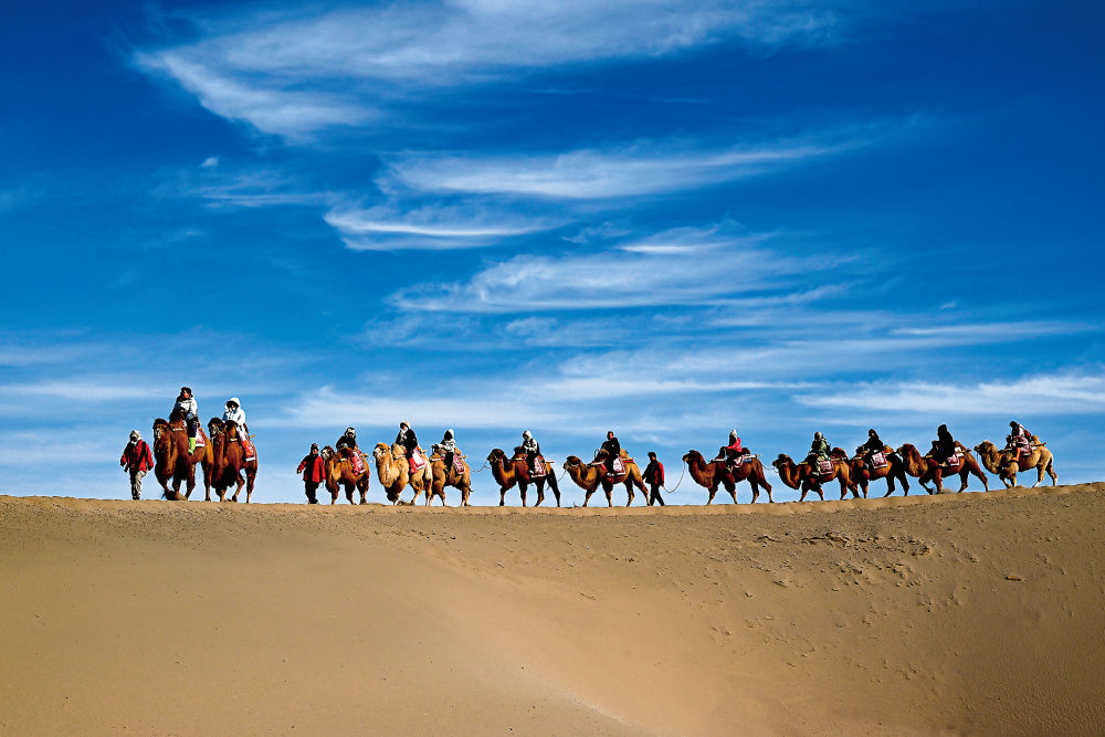 游客骑骆驼在甘肃省敦煌市鸣沙山月牙泉景区游览。张晓亮摄