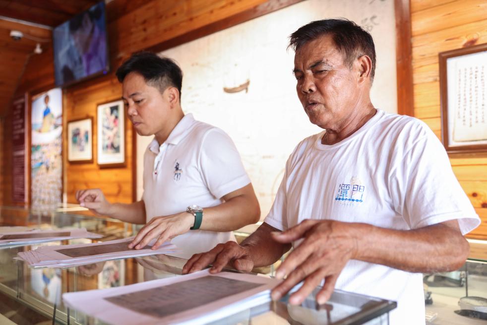 7月22日,在海南省琼海市更路簿博物馆内,王振忠(左)和王书保整理更路簿复印件。