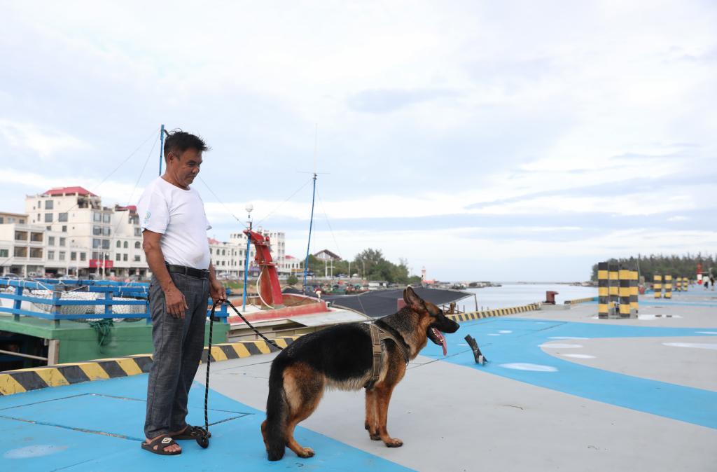7月22日,在海南省琼海市潭门镇,王书保在遛狗。