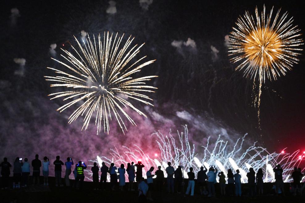 8月10日,游客在宁夏中卫市沙坡头区观看烟花表演。(袁宏彦 摄)