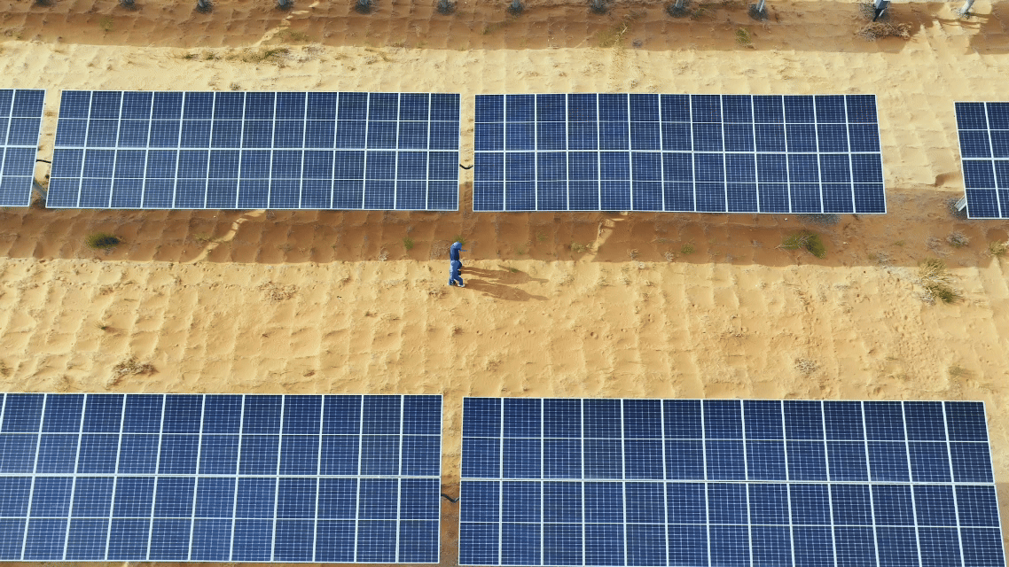 无人机掠过宁夏余丁光伏电站,120万块光伏板在戈壁上铺展成蓝色海洋,正随着日头缓缓转动。我曾多次踏入戈壁与沙漠中的光伏电站,但是这种黄色与蓝色的鲜明对比,总会在烈日与风沙中给我新的震撼。