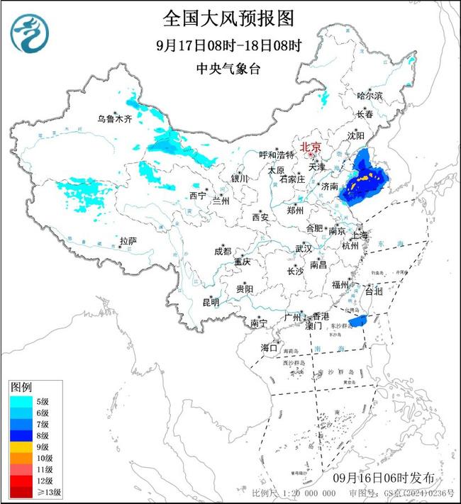 中央气象台9月16日06时继续发布大风蓝色预警: