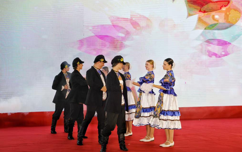 在美食摊前举杯碰盏,于舞台上下共舞同歌。舞台中央柔美大气的开场舞刚收尾,俄罗斯演员便踩着明快节拍登场,裙摆飞扬,靴声清脆,引得台下观众阵阵掌声。俄罗斯姑娘瓦利西亚举着手机凑近舞台,“我想把这样的热闹记录下来,这里的节日气氛让人难忘。”她笑着说。