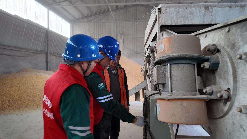 河北省电力工人对烘干机、脱粒机等农业设备开展用电安全隐患排查。新华社记者王昆 摄