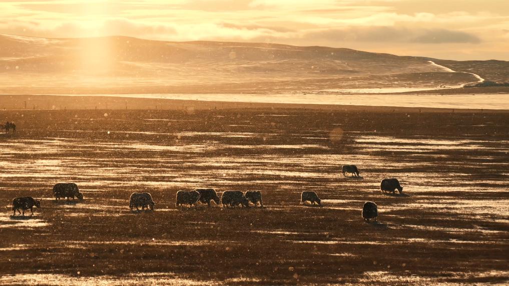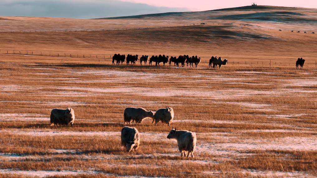 锡林郭勒的落日时分,漫天雪花碎金般飞舞。骆驼群沉稳徜徉,白牦牛群悠闲食草,夕阳逆光让它们的身影镀上一层温暖金边。
