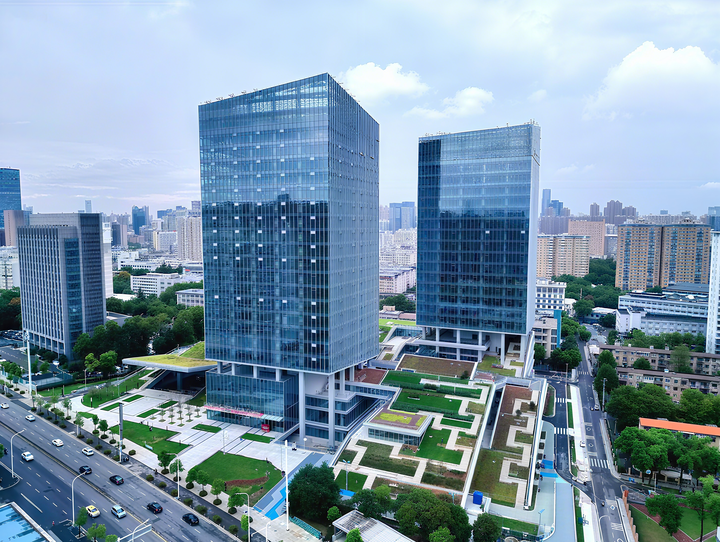 走进武昌区八一路,两座近百米高的现代塔楼吸引往来市民的目光。高低起伏的绿色坡顶裙楼环绕相连,层叠起伏的连绵“绿丘”与不远处的珞珈山遥相呼应,透露出与周边建筑不同的“现代范”。