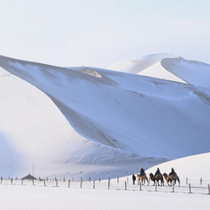 游客在甘肃省敦煌市鸣沙山月牙泉景区骑骆驼,观赏雪景。新华社发(张晓亮 摄)