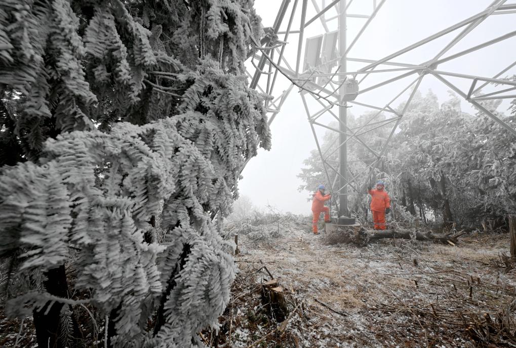 1月19日,孝感供电公司输电运检人员正在开展覆冰观测。新华社发(余健兵 摄)
