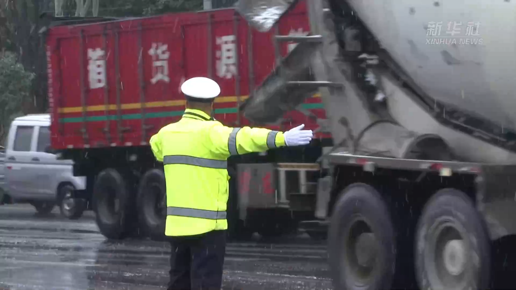 地处鄂西北的湖北十堰成为省内首批迎来雨雪天气的地区。风雪中,当地交警在高速公路出口等车情复杂区域指挥过往车辆安全通过。