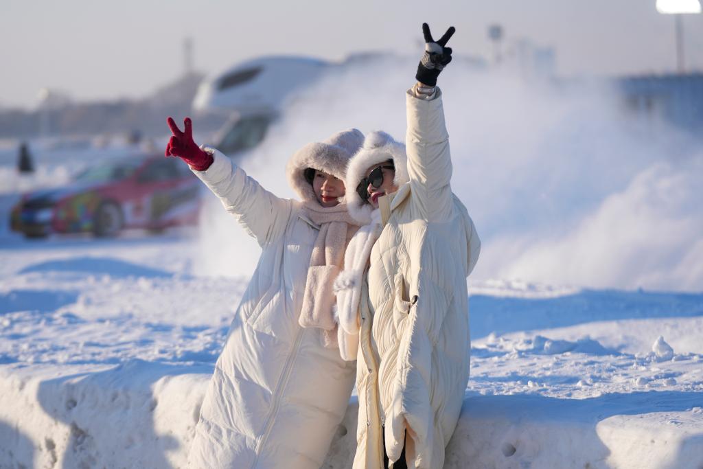 1月10日,游客在松花江哈尔滨段江面上体验“泼水成冰”。新华社记者 王建威 摄