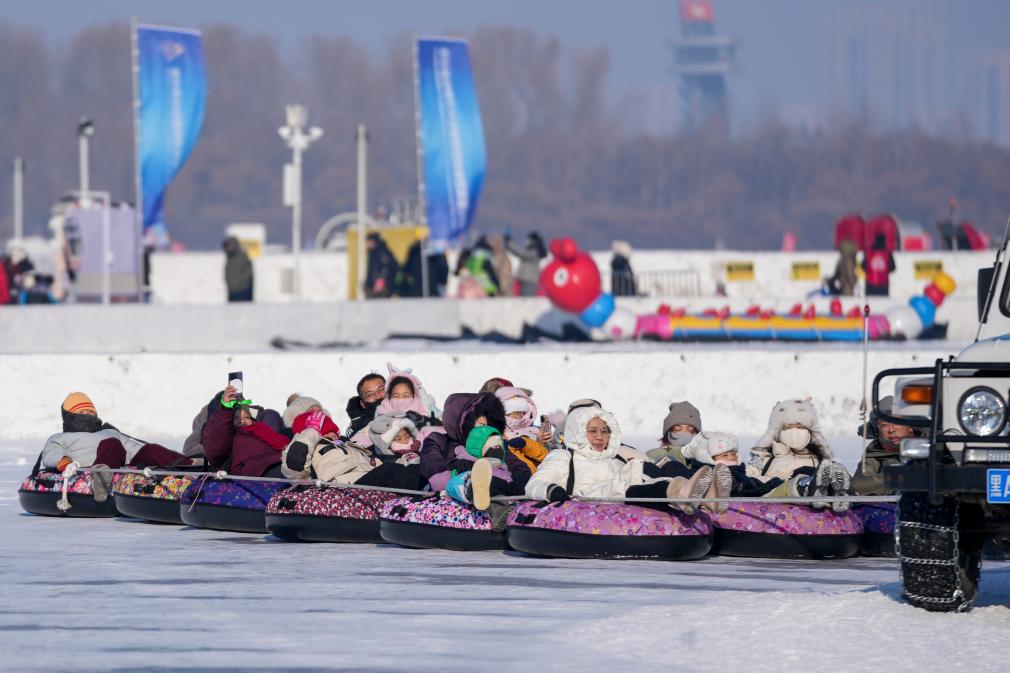 1月11日,游客在松花江哈尔滨段江面体验冰雪娱乐项目。新华社记者 王建威 摄