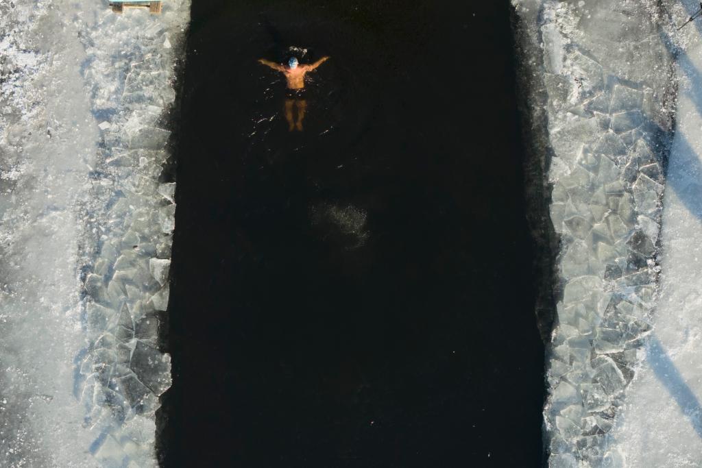 2025年12月12日,冬泳爱好者在哈尔滨中东铁路公园冬泳场游泳(无人机照片)。新华社记者 张涛 摄