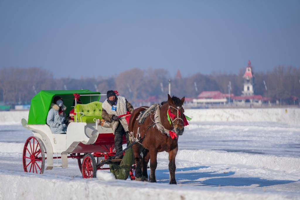 1月11日,游客在松花江哈尔滨段江面上乘坐马车。新华社记者 王建威 摄