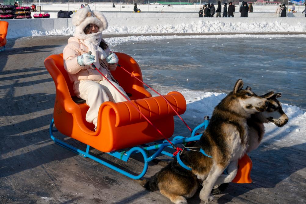 1月5日,游客在哈尔滨冰雪嘉年华园区乘坐机器人拉爬犁。新华社记者 张涛 摄