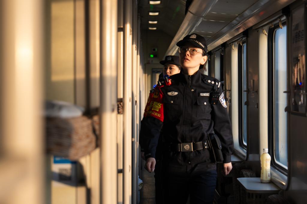 在列车上,乘警们会定时巡逻,排查安全隐患。新华社发(杨晓玲 摄)