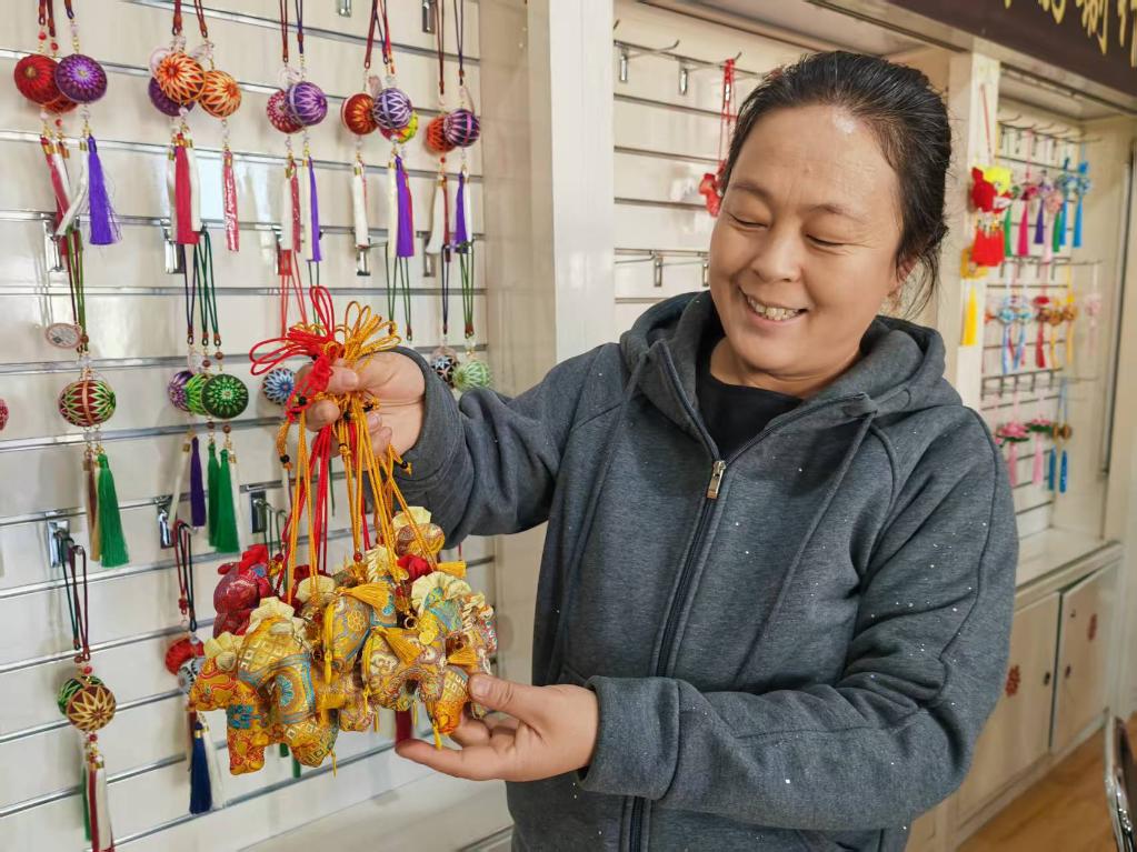 2月5日,山阴县众福缘农副产品手工加工专业合作社成员卫加玉正在展示走俏的马年香包。新华社记者 解园 摄