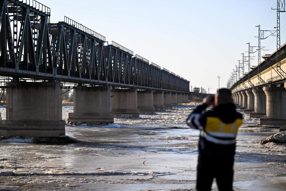 2月10日,白宇泰(前)在包银高铁磴口黄河特大桥下进行巡检作业。新华社记者 李志鹏 摄