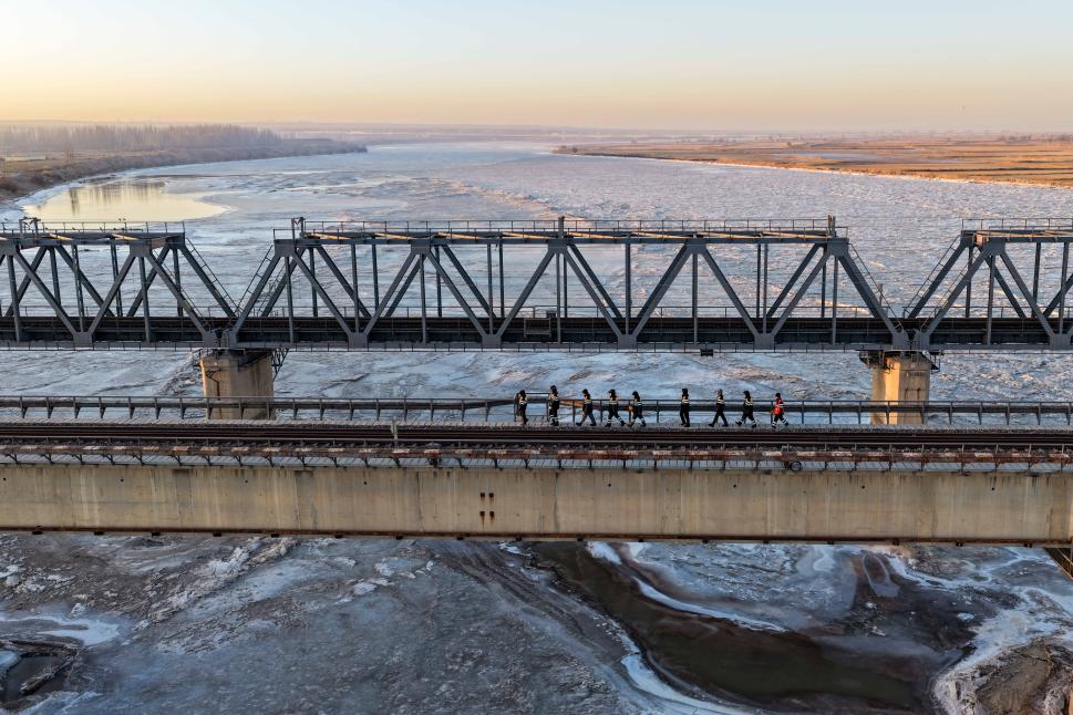 2月11日,桥隧工人作业结束后走在包兰铁路三盛公黄河铁路特大桥二号桥上(无人机照片)。新华社记者 李志鹏 摄