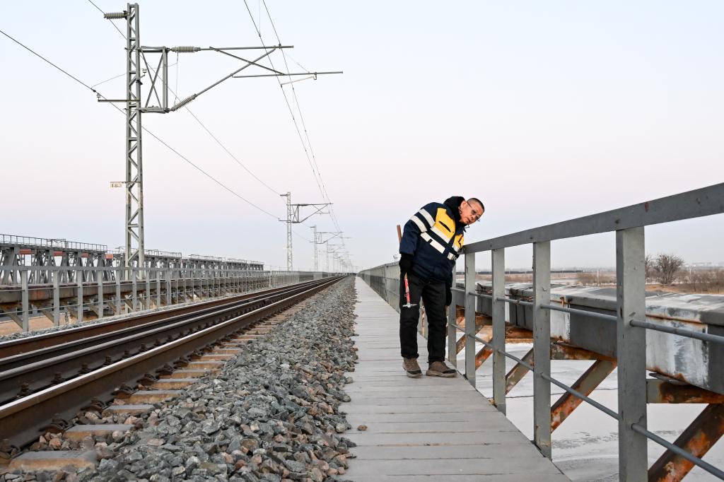 2月11日,马瑞祥在包兰铁路三盛公黄河铁路特大桥二号桥上进行巡检作业。新华社记者 李志鹏 摄