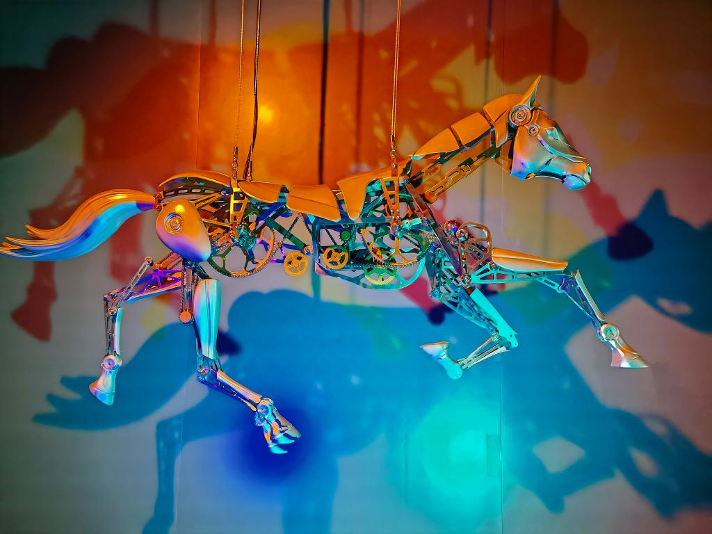 临近展览尾声,一匹机械马不停奔跑,它不仅拥有500多个国产精密金属构件,关键结构件也采用我国原创的工业级3D打印设备制成,整匹“马”由国产高响应伺服电机驱动,集成多连杆机构和曲柄滑块传动系统,模拟真实马的骨骼与关节运动。这匹“神驹”向观众道别,仿佛又在说:“让我们马不停蹄,奋勇向前!”