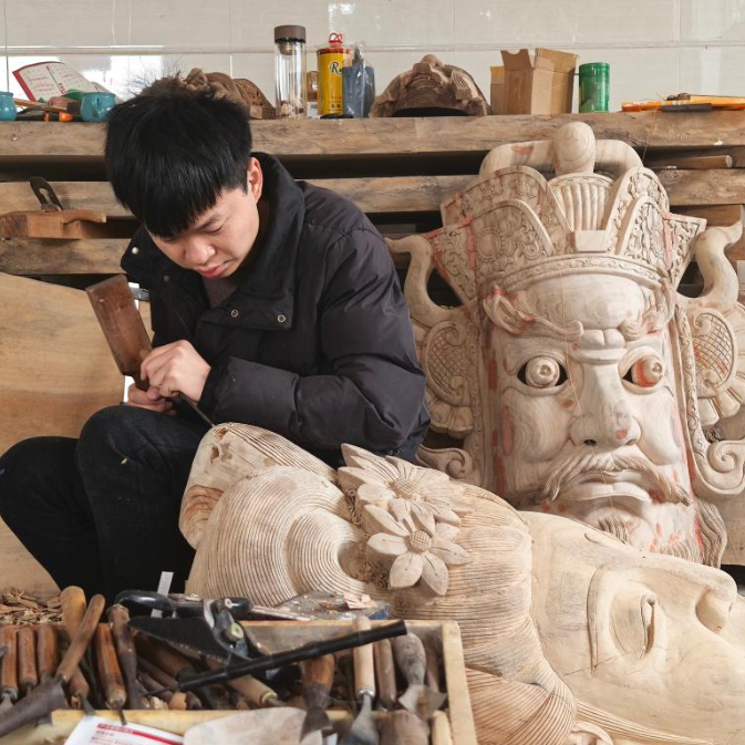 图为彭增协正在雕刻傩面具。新华社记者 张东阳 摄