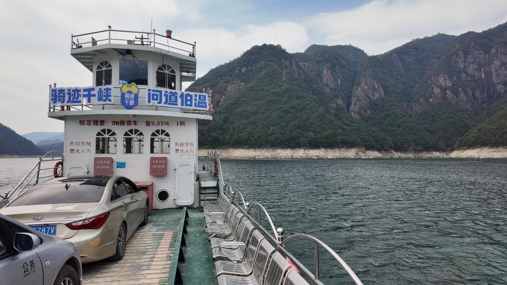 2月9日,轮渡船刚刚驶出北山镇黄岭头码头的渡口,正载着汽车穿行千峡湖,前往湖中村。新华社记者张璇 摄