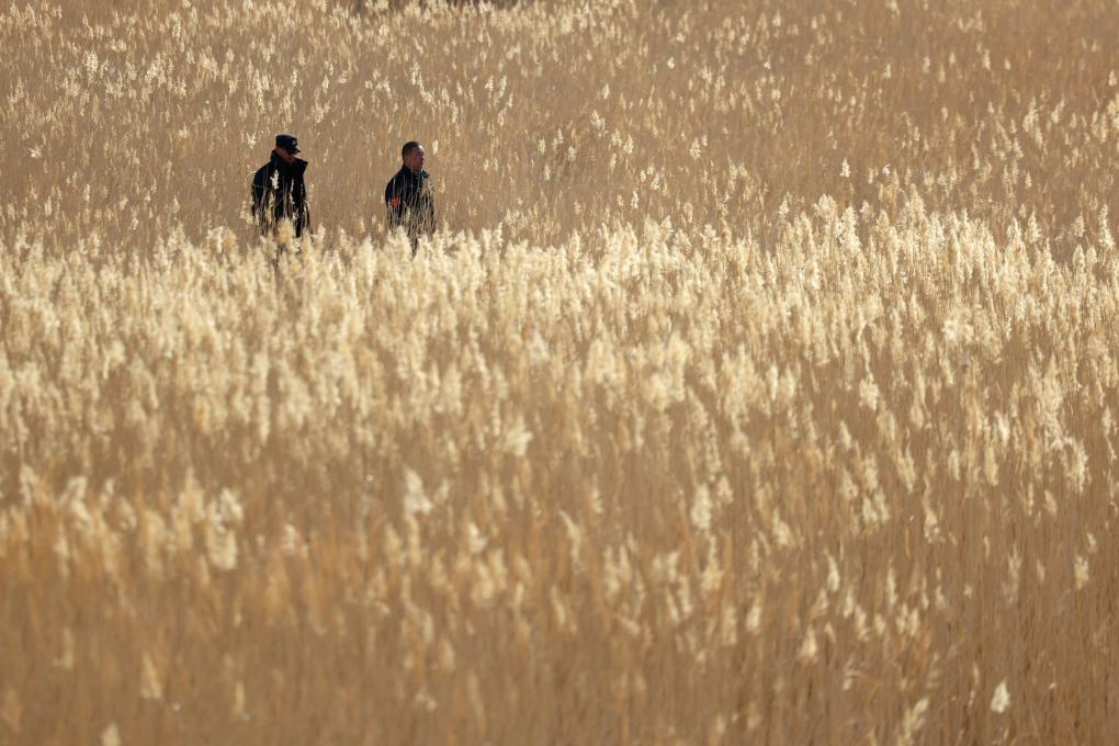 凭着多年巡护经验,吴兴东带队走进一片名为马圈湾的草海。这里芦苇茂盛,远远望去满目金黄,美不胜收。可踏入其中,滋味却并不好受。干枯的芦苇底叶硬如尖刺,扎得小腿生疼。脚下盐碱地泛着白霜,十分脆,踩上去深一脚浅一脚。