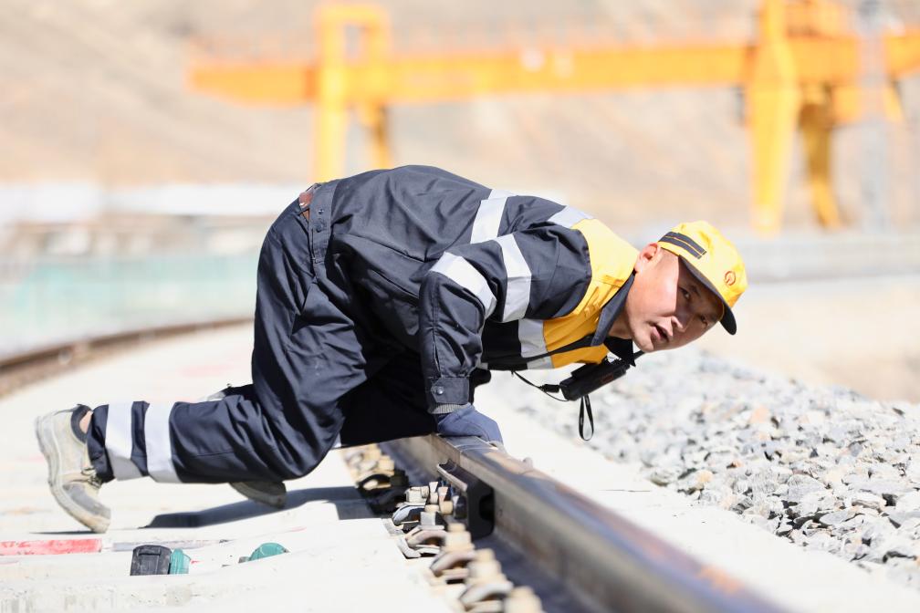 2月11日,日喀则线路工区工长索朗多布杰正在检查钢轨。(拉巴次仁 摄)