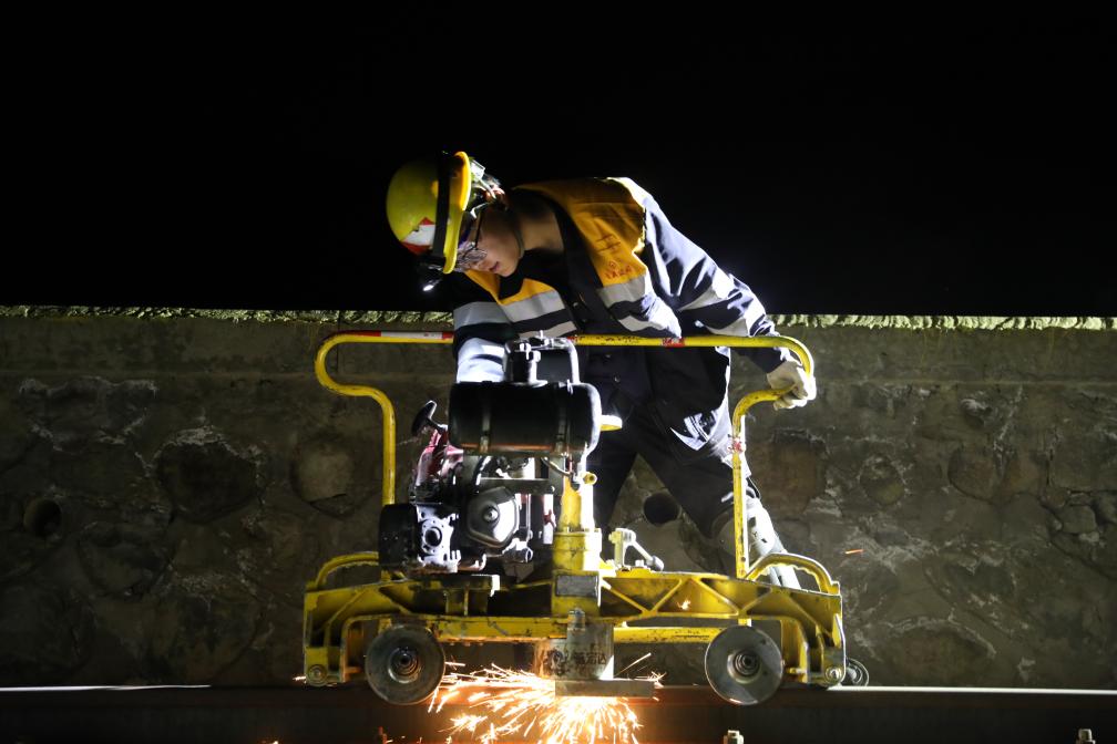 2月11日,日喀则线路工区职工正在用打磨机打磨钢轨焊缝。(拉巴次仁 摄)