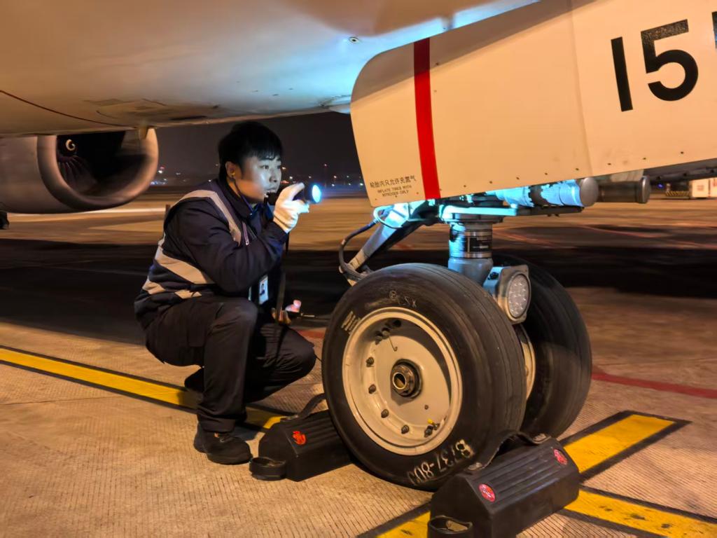 “过站航班经停只有55分钟,扣除上下客和清洁时间,留给我们的检修窗口只剩30分钟。”田新一边绕机检查一边向记者介绍,常年的“实战”让班组每个人都练就了“火眼金睛”,轮胎是否超标磨损、机身有无细微损伤,只需一眼便能判断。话音未落,他已完成机身蒙皮、起落架等10余项飞机外部检查。