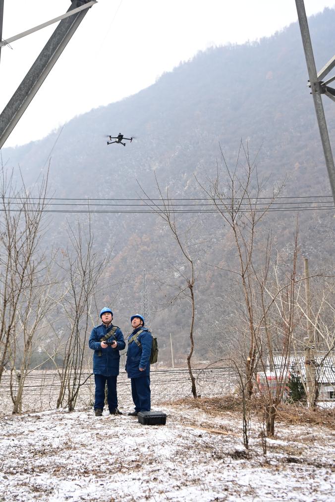 国网宝鸡供电公司输电运检中心秦岭输电运维班班长周红亮(左)、副班长令云在宝鸡市凤县黄牛铺镇东河桥村附近使用无人机检查线路覆冰情况。新华社记者 邹竞一 摄