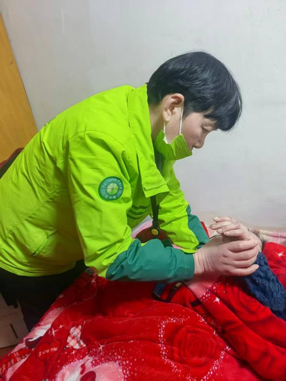 刘爱秀放下包,先帮叶素珍翻了个身,仔细检查后背的皮肤。然后端来一盆温热的洗脚水,蹲在床边,一只手托起老人的脚,一只手撩着水轻轻搓洗。
