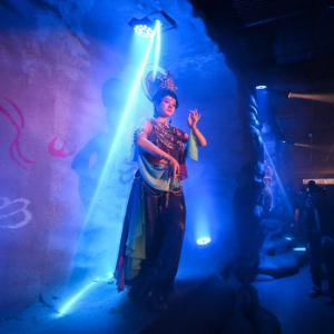 马年春节期间,宁夏银川市贺兰山下格外热闹。走进西夏陵博物馆后数百米长的廊道,游客仿佛穿越回千年前的西夏——身着各民族传统服饰的“商贾”沿街叫卖,“麻魁”女兵英姿飒爽,西夏壁画中的“飞天”在神秘烟雾与灯光中翩跹起舞……