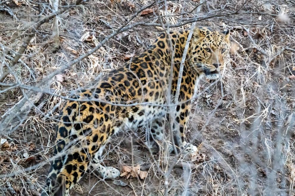 2月23日,吉林摄影师王莅翔在位于东北虎豹国家公园腹地的吉林省珲春市镇安岭村附近公路邂逅一只野生东北豹。据王莅翔介绍,这只东北豹从公路窜至山林后驻足回望,和他对视了数秒。