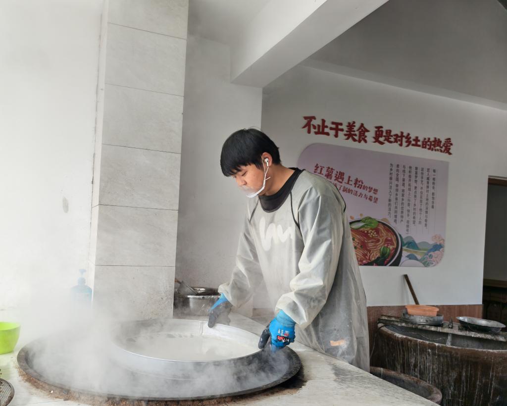 李庄村小微富民业态小巷的食品作坊中,村民正在制作红薯粉皮。新华社记者 张武岳 摄