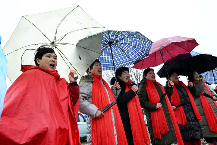 裹着雨衣的观众穿行在艺人中间,一个个手里举着手机,侧耳倾听。
