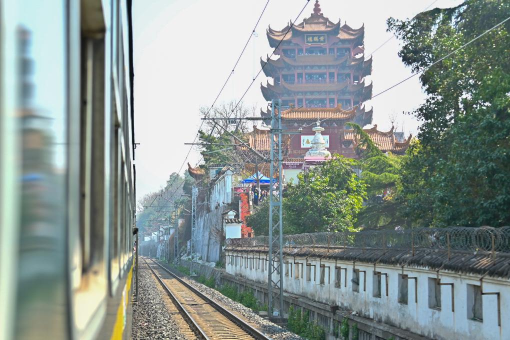 武汉市内普速环线列车经过黄鹤楼。(受访者供图)