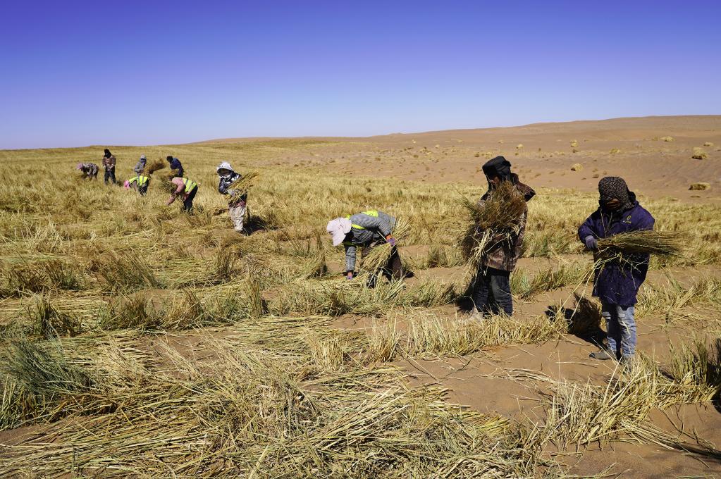 与此同时,内蒙古巴彦淖尔市乌拉特后旗开展沙漠生态综合治理工作,组织工人利用稻草铺设草方格沙障。在连绵起伏的沙丘上,纵横交错的草方格犹如排列整齐的“魔方”,将一个个沙丘分割、锁定。