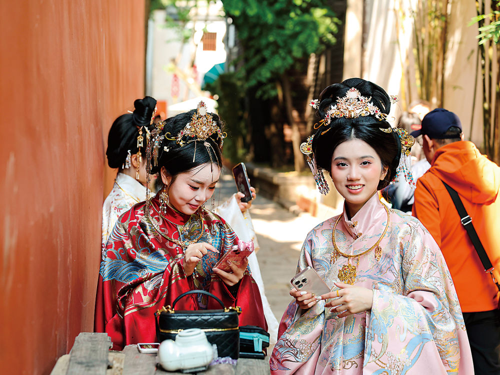 “今年春节期间,门店体验客流同比增长一倍以上。”福州市传统梳妆技艺三条簪非遗项目负责人黄秋辉介绍,因摄影师、妆造师人手有限,单日接待量受限,不少游客宁愿排队等候、调整时间,也要体验传统三条簪造型。