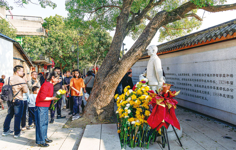 2月22日,市民游客在吴石故居前的广场上向吴石塑像献花。新华社记者魏培全摄