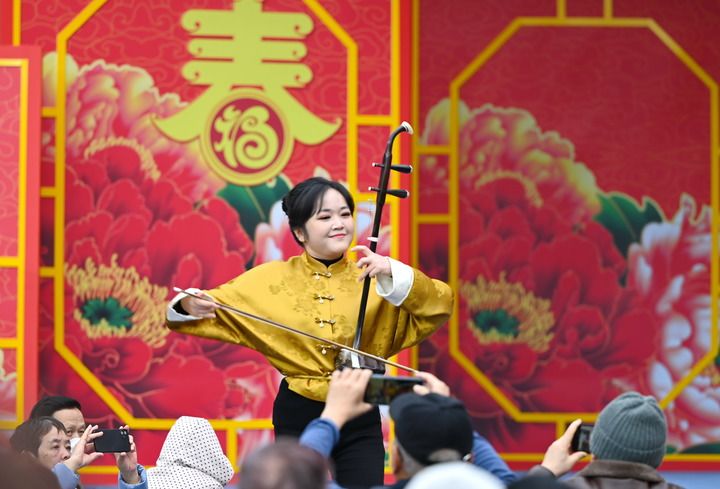 2月17日,福建省歌舞剧院民族乐团演员林敏在福州西湖公园“周末戏相逢”公益演出现场表演二胡独奏《战马奔腾》。新华社记者林善传摄