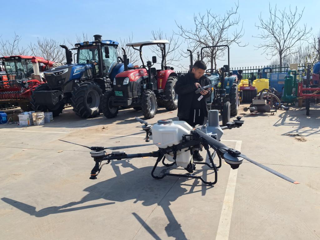 3月19日,河南省濮阳市清丰县惠农农机农民专业合作社的工作人员在调试无人机。新华社记者马意翀 摄