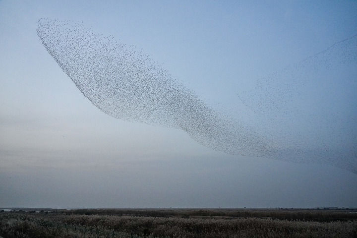 2025年11月12日,山东黄河三角洲国家级自然保护区内,飞翔的越冬候鸟形成“鸟浪”景象。新华社记者 朱峥摄