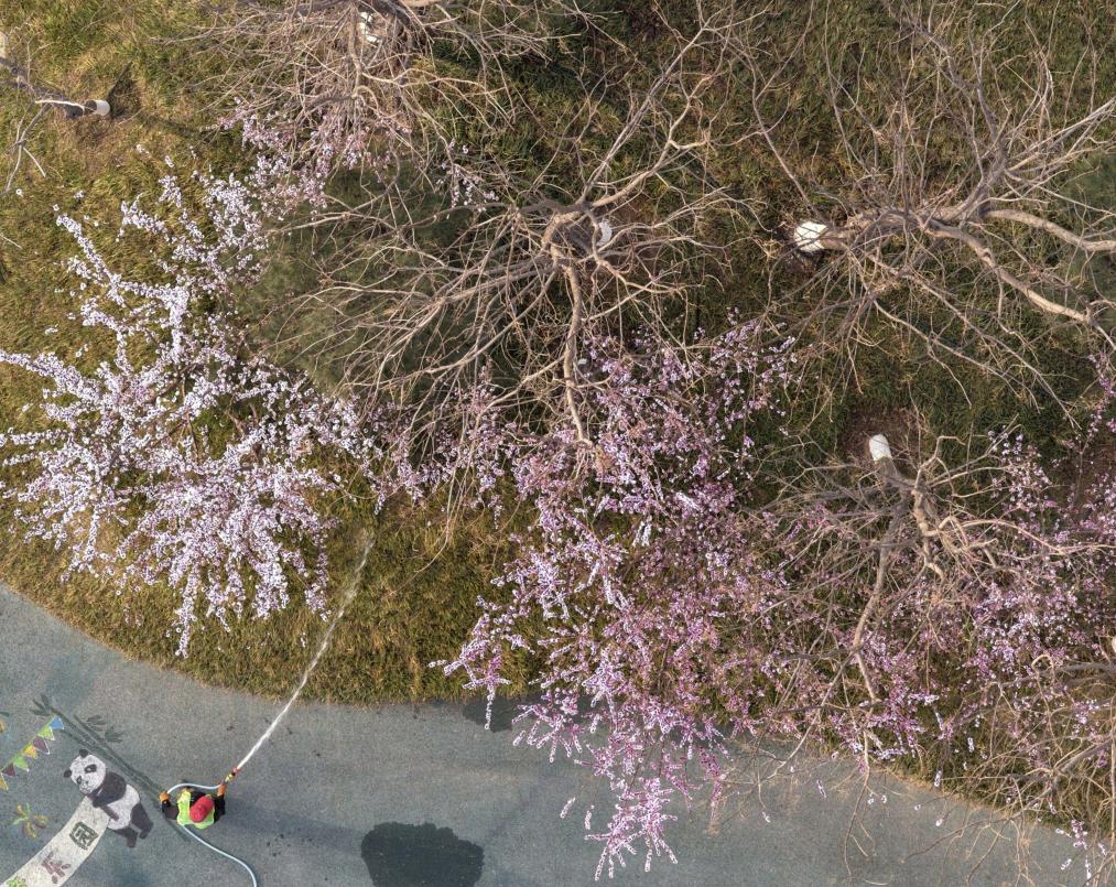 ↑3月27日,工人在雄安新区悦容公园浇花(无人机照片)。