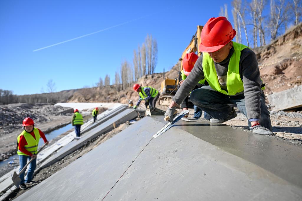 3月27日,在新疆伊犁哈萨克自治州新源县,施工人员正在修建大吉尔格朗河护岸。新华社记者丁磊 摄