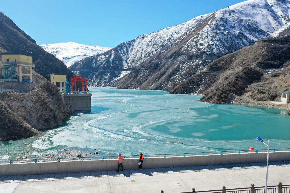 3月27日,在新疆伊犁哈萨克自治州新源县恰普河水利枢纽,运管人员正在巡查(无人机照片)。新华社记者丁磊 摄