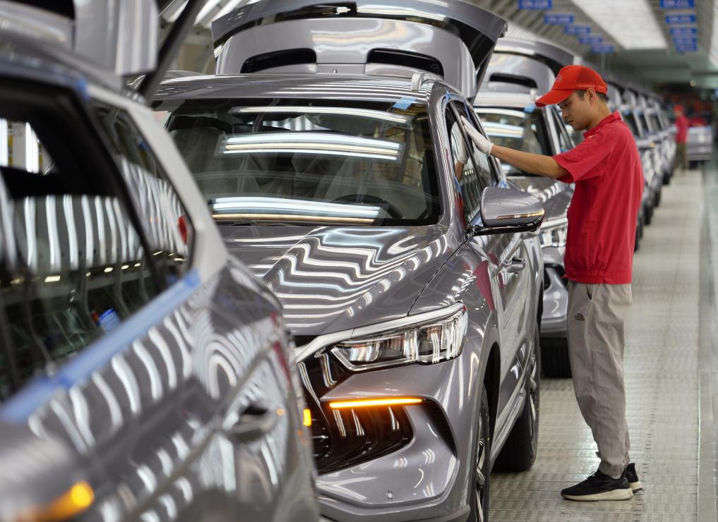 工人在郑州市航空港区的新能源汽车生产线上对车辆进行质检。新华社记者 李嘉南 摄