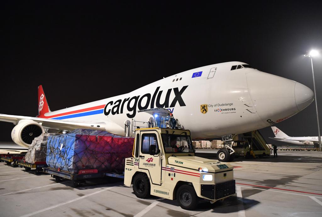 在郑州新郑国际机场,工作人员为一架卢森堡货航货机卸货。新华社记者 李嘉南 摄