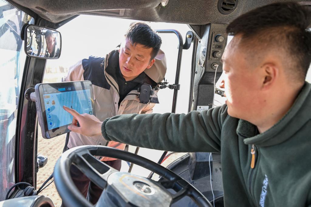 在新疆伊犁哈萨克自治州察布查尔锡伯自治县孙扎齐牛录镇,罗俊杰(左)和农机手查看北斗自动导航系统确定播种地块(2026年3月24日摄)。新华社记者 丁磊 摄