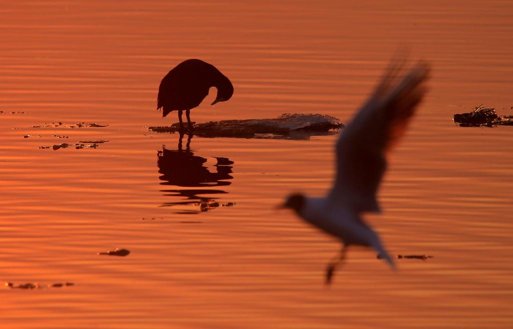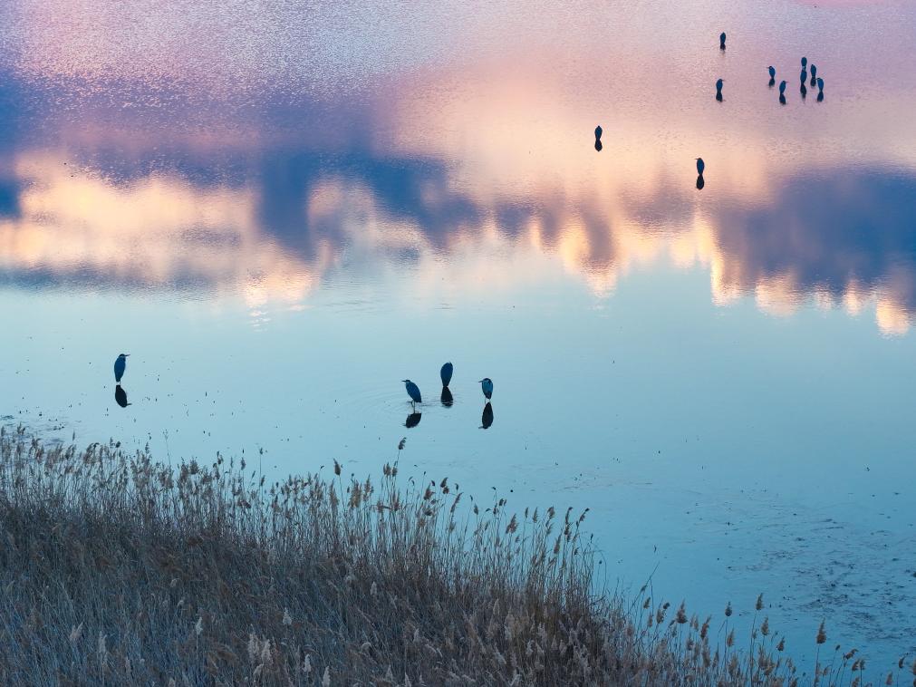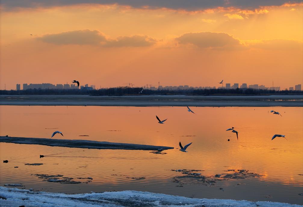 3月30日,候鸟在松花江哈尔滨段的暮色中休息。新华社发(张树 摄)